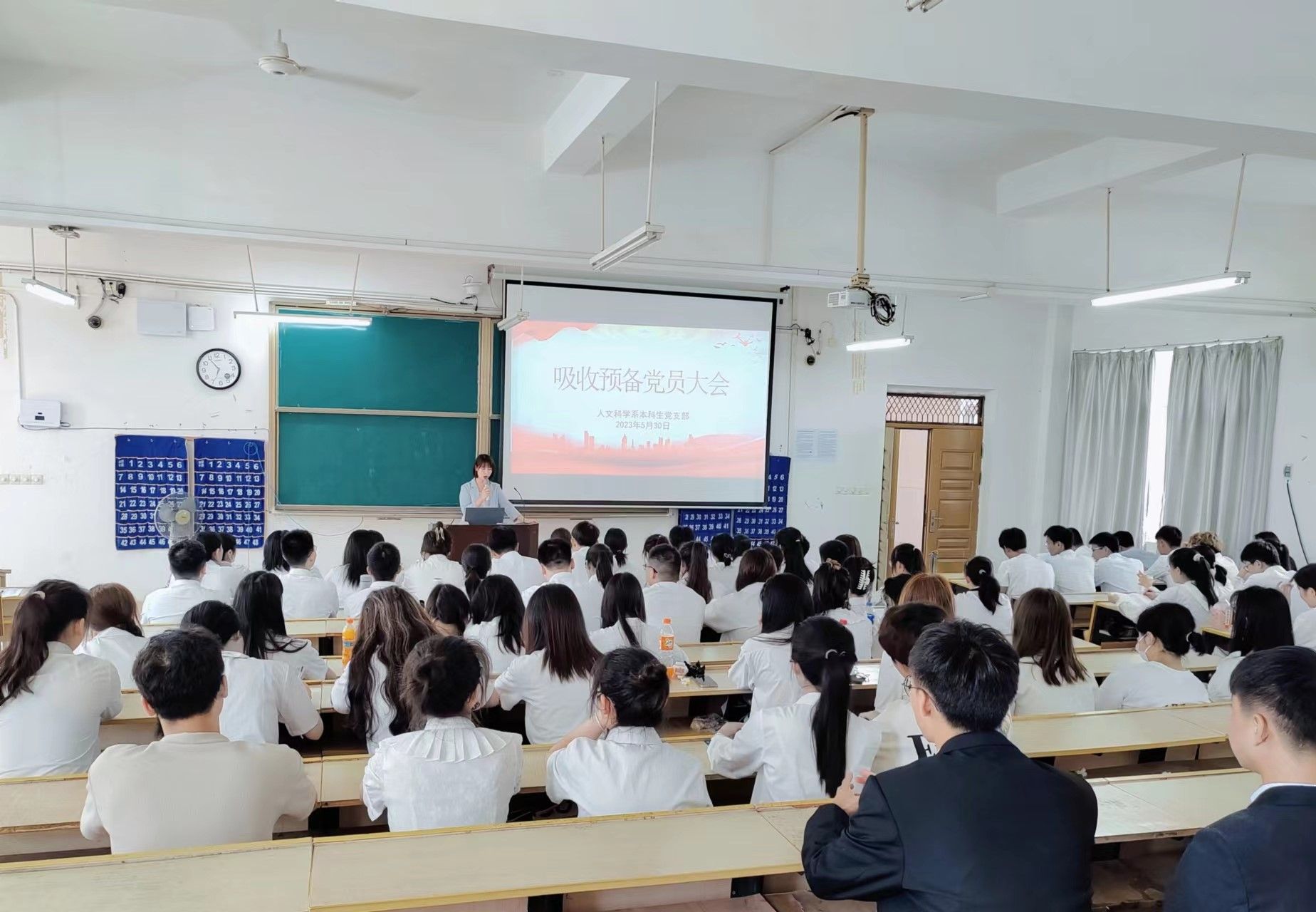 5月30日下午,人文科学系本科生党支部于主教Z1D2召开接收预备党员支部党员大会,讨论和通过孔琦等29名同志加入党组织的相关事宜,大会由支部书记牛英萍同志主持。