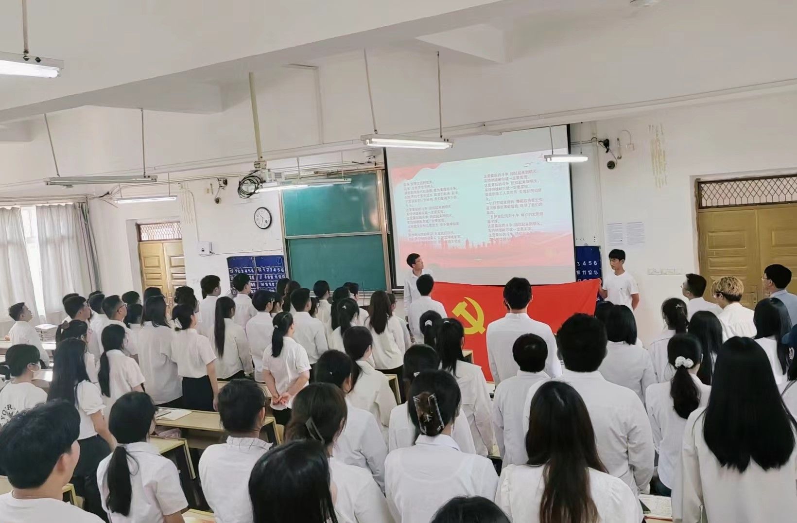最后由牛英萍宣布同意孔琦等29名同志入党的支部决议,正式授予预备党员同志们党徽,并带领预备党员同志们面对党旗进行庄严宣誓。宣誓结束后,牛英萍对被接收为预备党员的各位同志表示祝贺。同时提出了殷切的希望,一是要加强政治理论学习,二是在思想上和行动上自觉地同党中央保持一致,三是严格要求自己,努力克服自身缺点,树立为共产主义奋斗终身的决心。