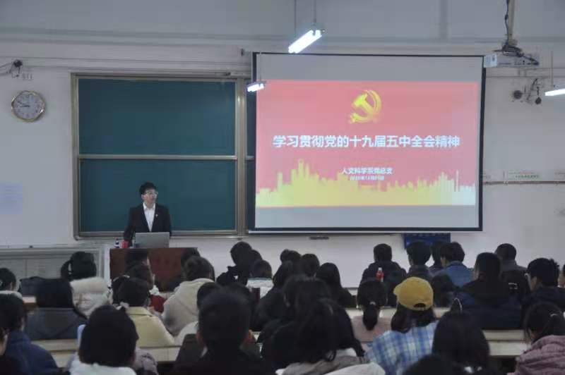 为了深入学习十九届五中全会精神,2020年12月01日下午14点人文科学系党总支组织2019、2020级全体学生学习党的十九届五中全会精神。人文科学系党总支书记李国鹏同志、人文科学系本科生支部牛英萍同志以及人文科学系团总支书记郭豪同志参加本次宣讲会。