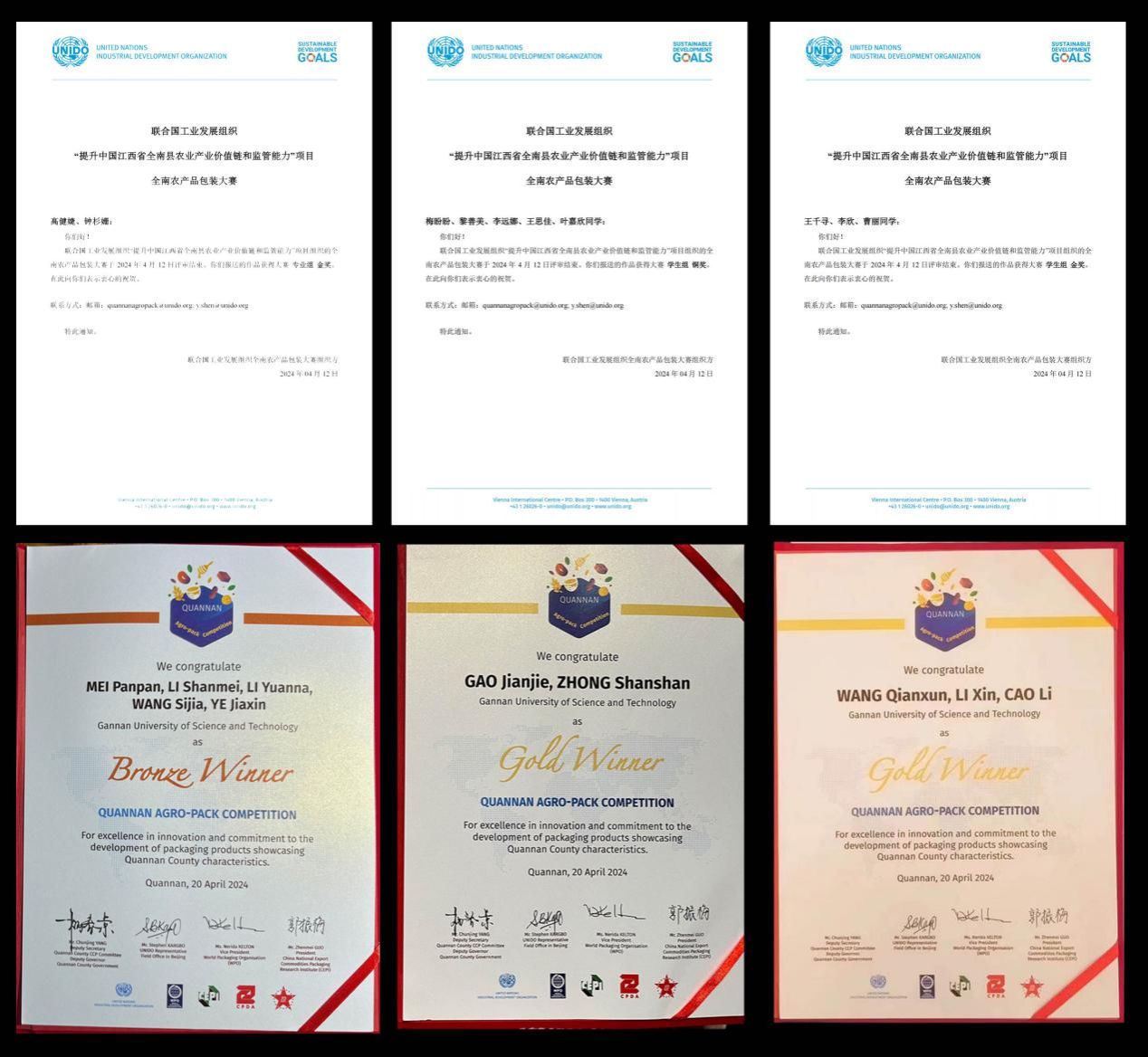 图一:联合国工业发展组织颁发的全南农产品包装设计大赛专业组金奖、学生组金奖及铜奖证书(图为伟德官网师生在联合国工发组织全南农产品包装大赛颁奖现场与国务院商务部及省市领导合影留念)。