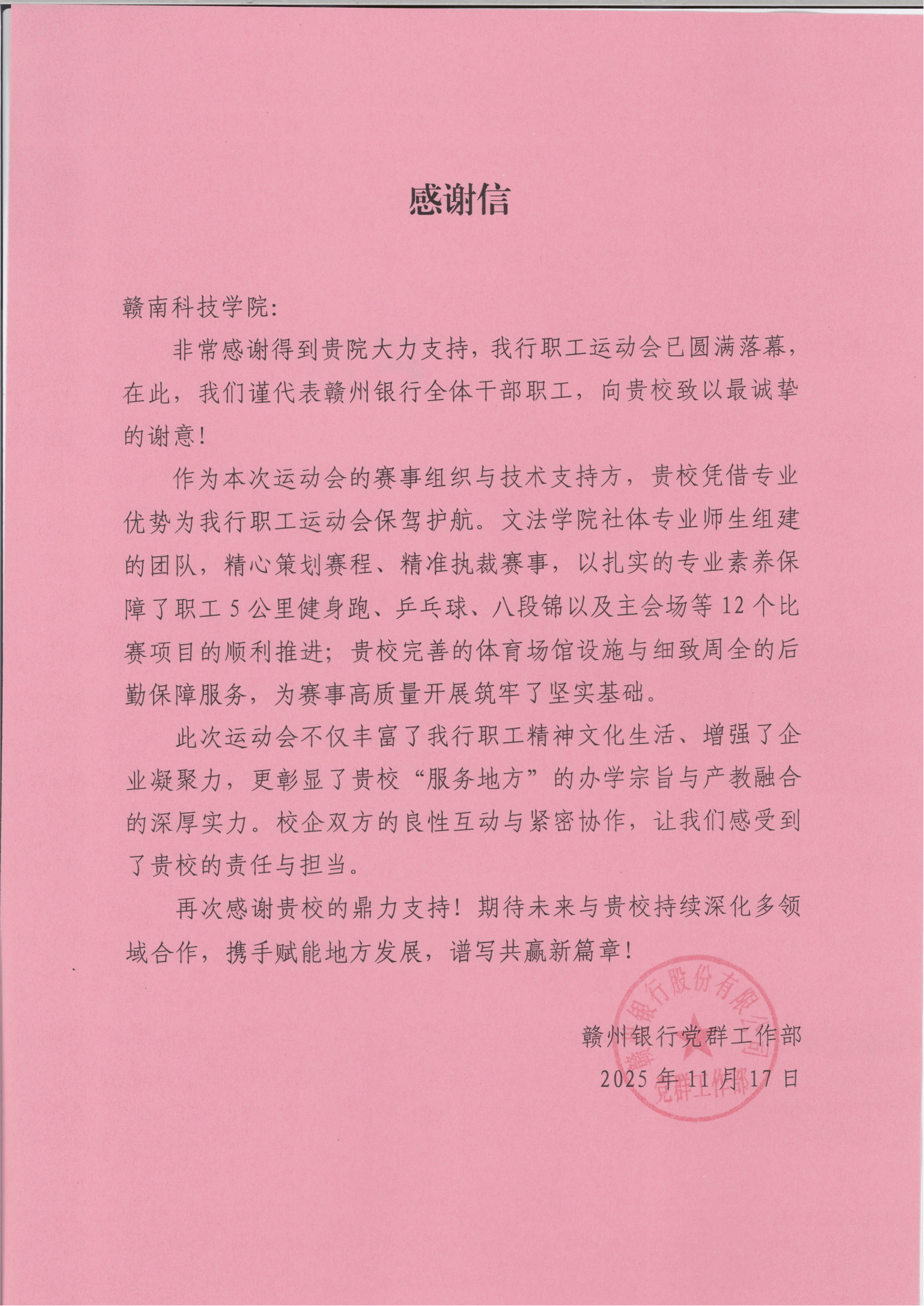 据悉,本届运动会历时七天,包括了5公里健身跑、乒乓球、八段锦、趣味项目等比赛项目,参与人数1000余人次,运动会结束后,赣州银行还专程发来感谢信,感谢学校的大力支持配合、感谢伟德官网师生专业和细致的服务。