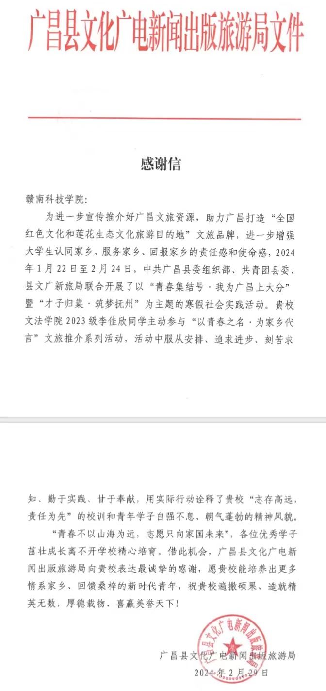 本网讯:近日,伟德国际victor1949收到了广昌县文化广电出版旅游局发来的感谢信。信中对伟德官网2023级英语专业李佳欣同学在“青春集结号·我为广昌上大分”的寒假社会实践活动中做出的积极贡献,给予高度评价和诚挚地感谢。