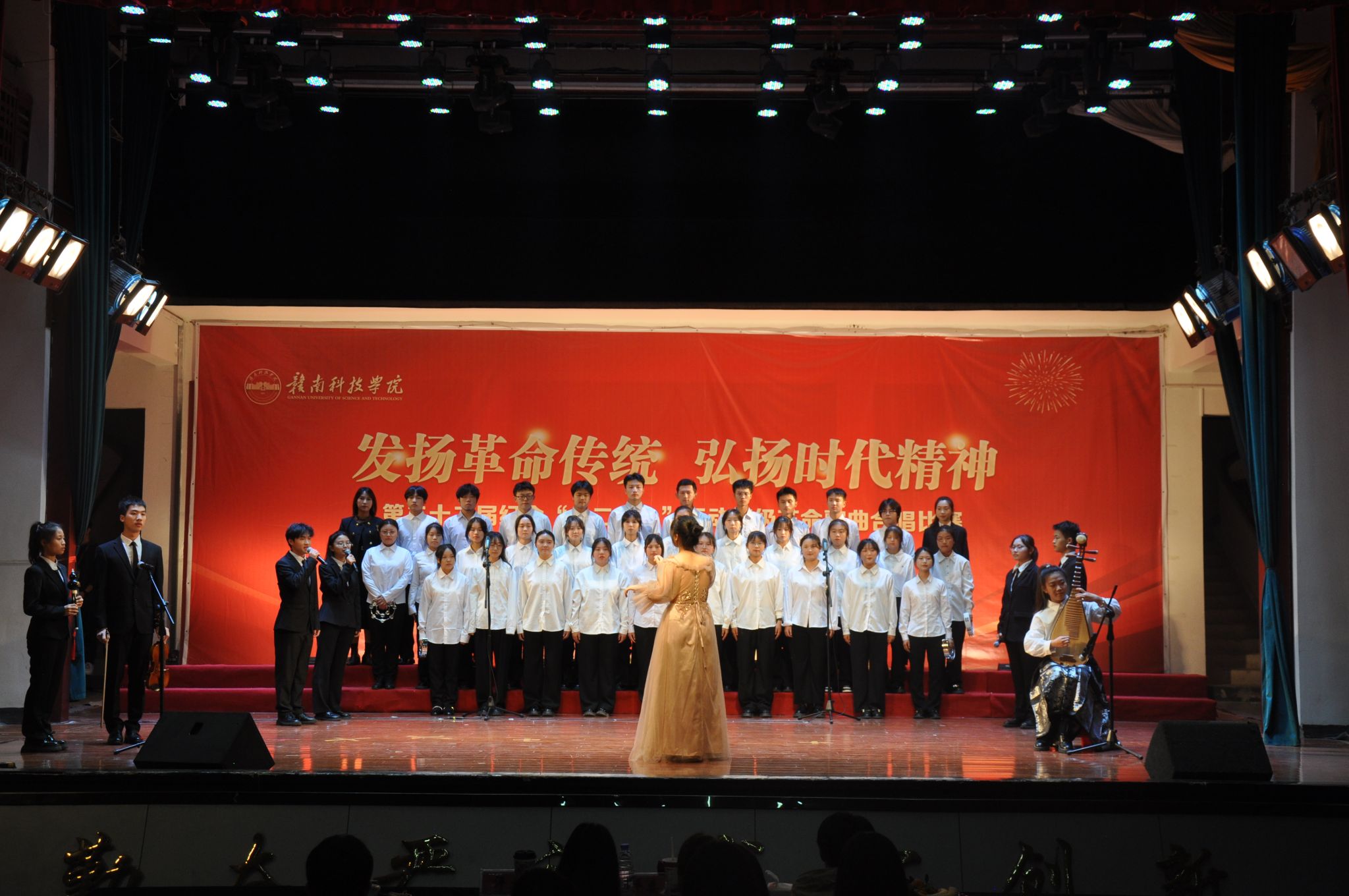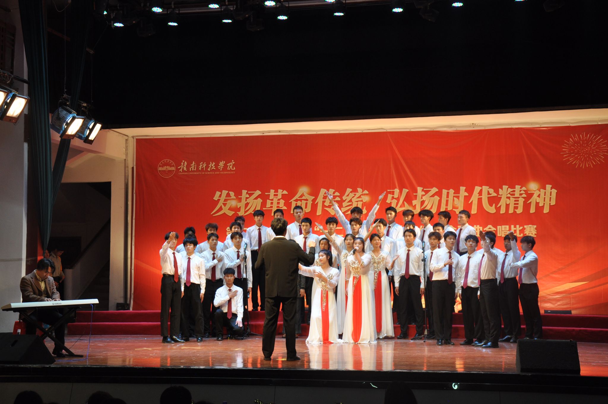 比赛分为新生组和老生组,三十四支参赛队伍着装统一,精神抖擞,情感真挚,热情澎湃,以“歌曲+朗诵”、“歌曲+乐器”等多种形式,以学生语言、学生视角、学生感悟,颂过去之壮阔,歌今时之成就。经过激烈角逐,最终由社体221班《祖国不会忘记》、社体231班《在灿烂的阳光下》荣获新、老生一等奖;社体212班《红军不怕远征难》、社体211班《不忘初心》、法学232班《弹起我心爱的土琵琶》、设计231班《映山红》荣获二等奖;英语212班《星辰大海》、社体222班《我宣誓》、视觉传达211班《万疆》、英语232班《如愿》、法学231班《国家》、社体232班《我站立的地方是中国》荣获三等奖。万德伟,朱润彧等六名同学分别获得最佳指挥奖,最佳领唱奖和最佳朗诵奖。