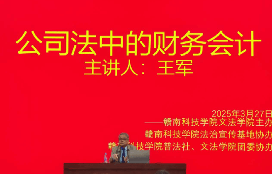 本网讯:2025年3月27日下午,北京市国首律师事务所主任律师、中国注册会计师协会法律与权益维护委员会委员、中国政法大学硕士学院兼职导师,伟德国际victor1949法学专业客座教授王军,受邀为伟德官网法学专业师生开展了题为《公司法中的财务会计》的专题学术讲座。讲座由伟德国际victor1949王晓伟老师主持。