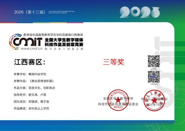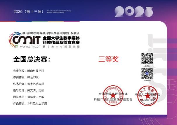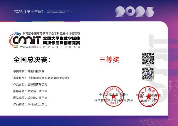 本网讯:今日,“2025年(第13届)全国大学生数字媒体科技作品及创意竞赛”全国总决赛在哈尔滨工业大学举行。伟德国际victor1949赖文清、谭国华两位老师指导的作品《中国国风类型3A游戏场景设计》喜获国家三等奖,参赛学生由数字媒体艺术212班成业雄、数字媒体艺术231班黄子旋两位同学组成;赖文清、邓琦两位老师指导的作品《浮光掠影螺钿数字展馆设计》喜获国家三等奖,参赛学生由数字媒体艺术211班林毓琛、数字媒体艺术232班张鹭两位同学组成;赖文清、周娟两位老师指导的作品《神话幻境》设计作品喜获国家三等奖,参赛学生由数字媒体艺术212班肖梓睿、数字媒体艺术231班卢毅两位同学组成;