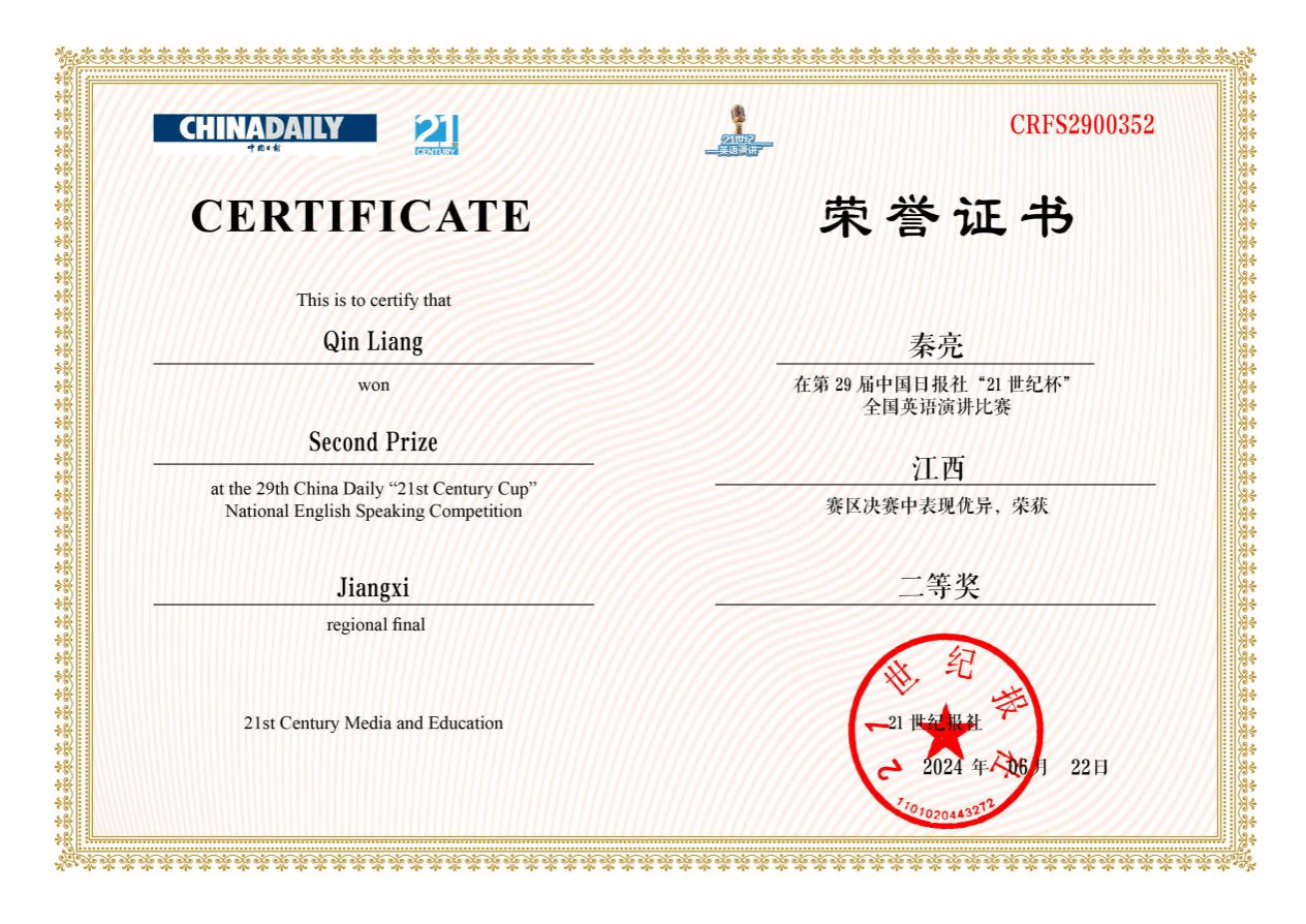6月22日,第29届中国日报社“21 世纪杯”全国英语演讲比赛江西赛区复赛在江西农业大学顺利举行,伟德官网自动化222班秦亮,英语222班邹婧乐分获江西赛区二等奖、三等奖。秦亮同学将和来自全省其它高校的九位同学代表江西赛区参加十月份在北京举办的全国半决赛。