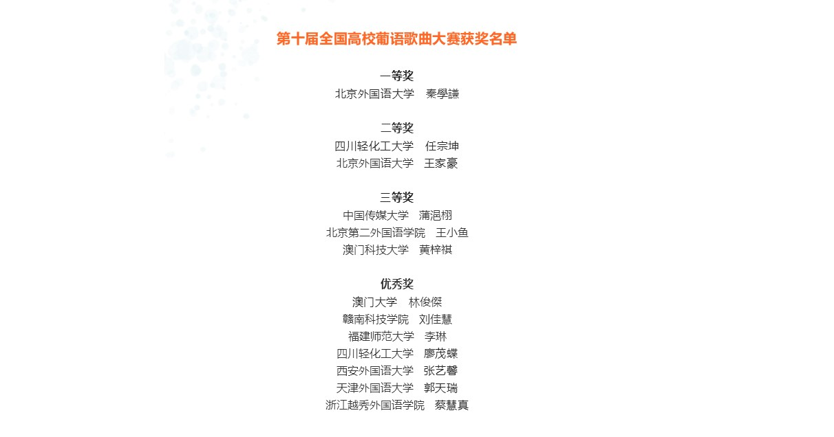 2022年11月19日,伟德官网葡语专业21级学生刘佳慧线上参加了第十届全国高校葡语歌曲大赛决赛并获得优秀奖。
