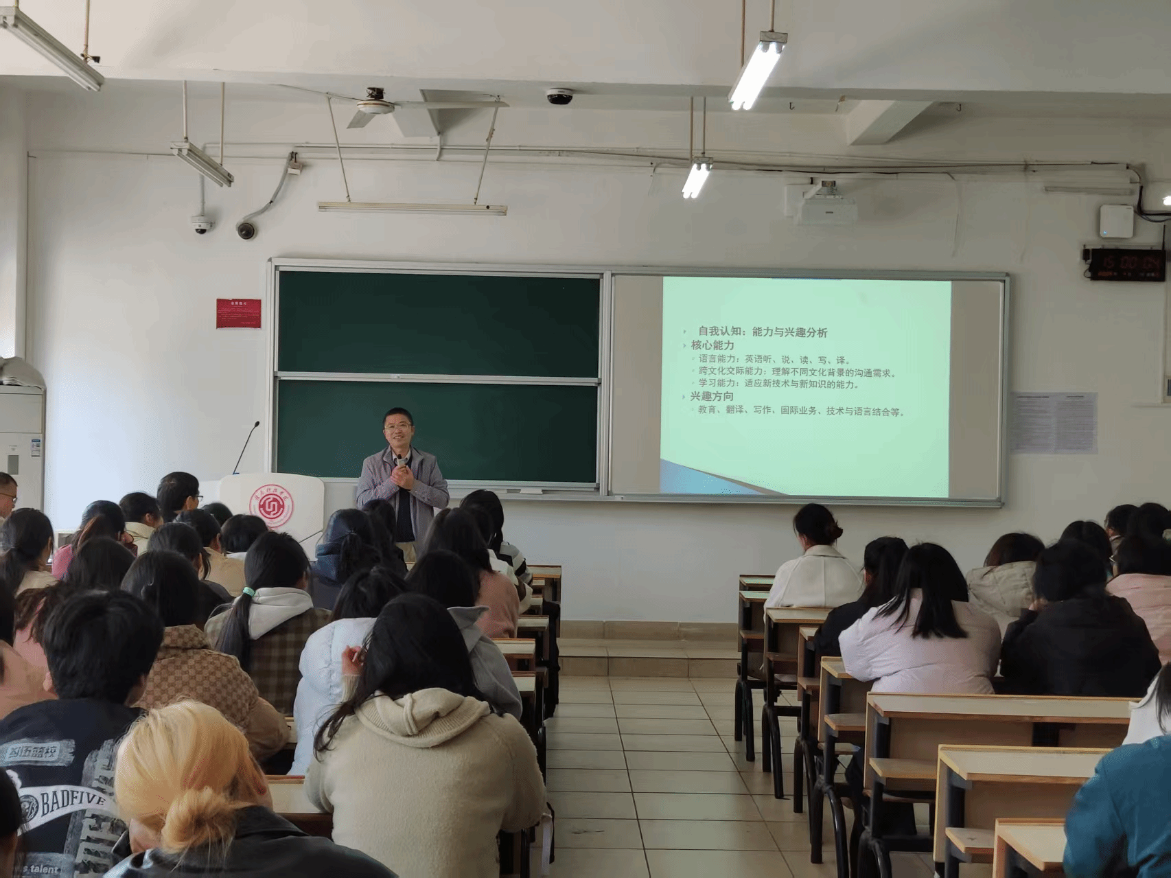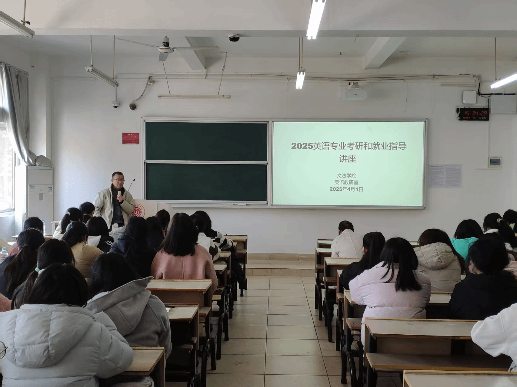 4月1日下午,伟德国际victor1949英语教研室邀请了江西理工大学外国语学院翻译硕士学位点负责人张建平教授、国际中文硕士学位点负责人钟舟海副教授、本科英语专业校级重点学科负责人陈二春教授,给伟德国际victor1949英语专业学生开展考研和就业指导讲座。