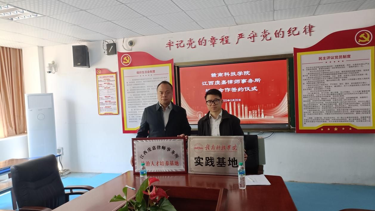 伟德国际victor1949党委委员王军堂和虔嘉律所副主任叶志超代表双方签署《校企合作协议》,并共同为“江西虔嘉律师事务所法治人才培养基地”及“伟德国际victor1949实践教学基地”授牌。