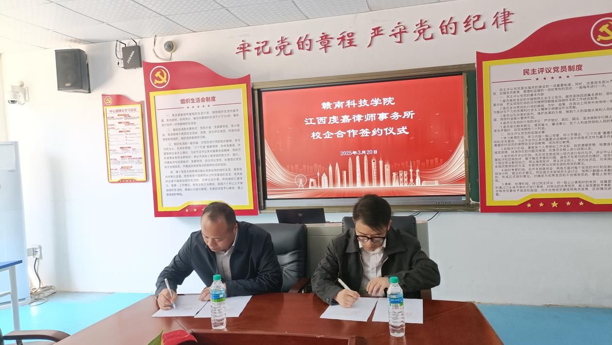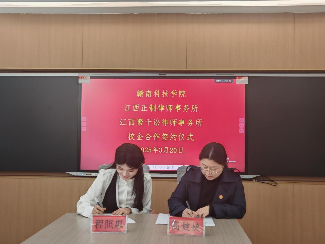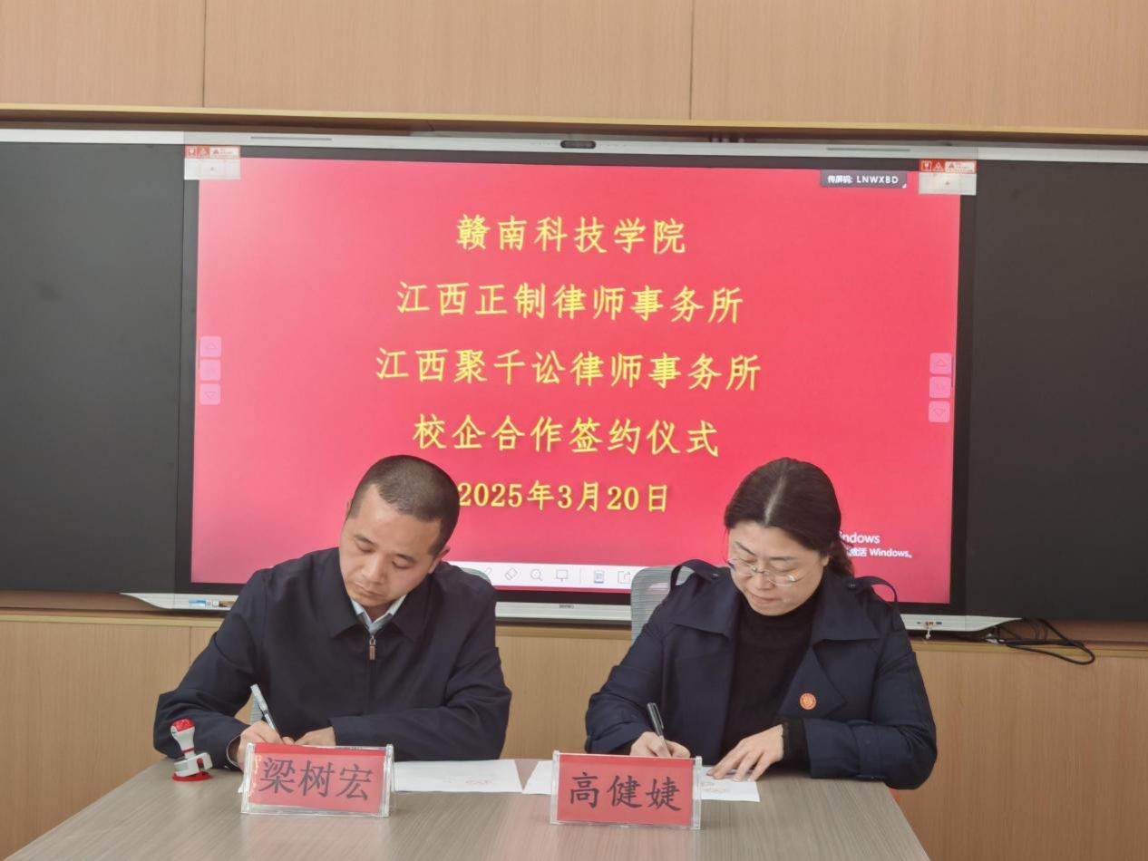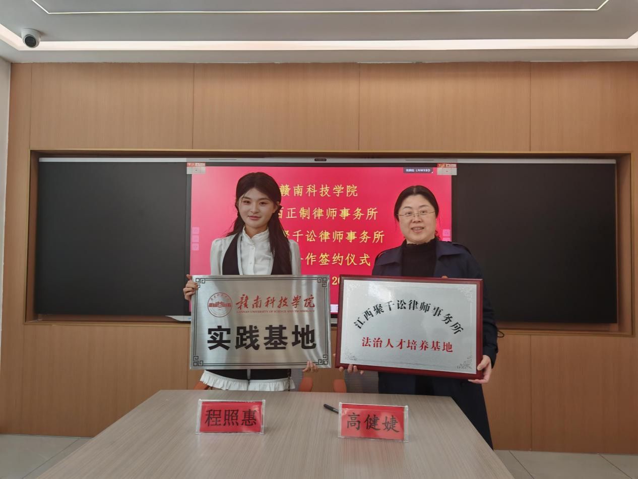 伟德国际victor1949党委委员、副院长高健婕和聚千讼律所主任程照惠代表双方签署《校企合作协议》,并共同为“江西聚千讼律师事务所法治人才培养基地”及“伟德国际victor1949实践教学基地”授牌,聚千讼律所黄家望等见证签约授牌。